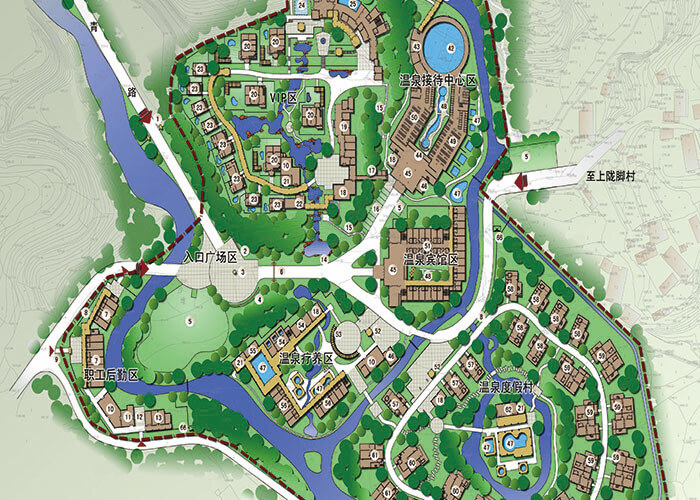 一條景觀主軸是通過大門區(qū)圓形廣場連系西端橋梁與東端溫泉賓館,并延伸至上部隴腳村,形成主要景觀游賞大道。二個(gè)溫泉旅游片區(qū);即北部公共溫泉接待片區(qū)、南部溫泉度假、療養(yǎng)片區(qū)。三塊自然臺(tái)地為北部鍋底箐峽谷河灘型臺(tái)地、南部田園風(fēng)光臺(tái)地、西北部山脊丘陵臺(tái)地。八個(gè)功能分區(qū)分別為入口廣場區(qū)、溫泉賓館區(qū)、溫泉接待中心區(qū)、公共溫泉區(qū)、VIP區(qū)、溫泉療養(yǎng)區(qū)、溫泉度假區(qū)、職工后勤區(qū)。