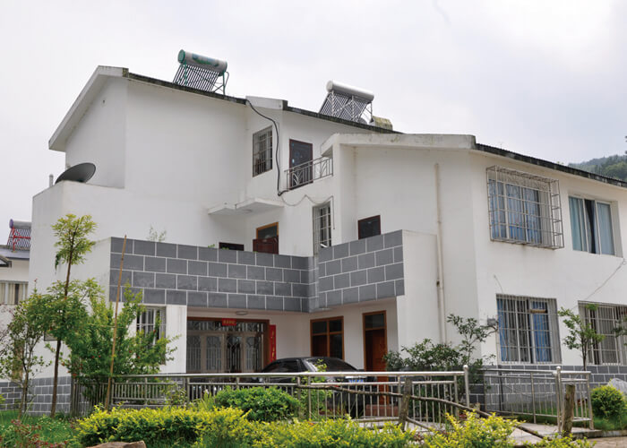 建筑形式上,采用傳統(tǒng)民居的院落形式。庭院是中國傳統(tǒng)民居的重要組成部分,其基本手段是圍合,表現(xiàn)形式是院落。庭院是中國人日常生活的基本場所。庭院代表的不僅是一種居住形式,更是一種情結(jié)。建筑可以是多層的并采取一樣的形制,院子可以做出形狀和大小不一的變化,通過這些變化就可以將內(nèi)、外、主、從等關(guān)系表達(dá)出來。設(shè)計(jì)中保留農(nóng)村傳統(tǒng)的堂屋、烤火間等居住形式,使居住在內(nèi)的村民產(chǎn)生強(qiáng)烈的歸屬感。